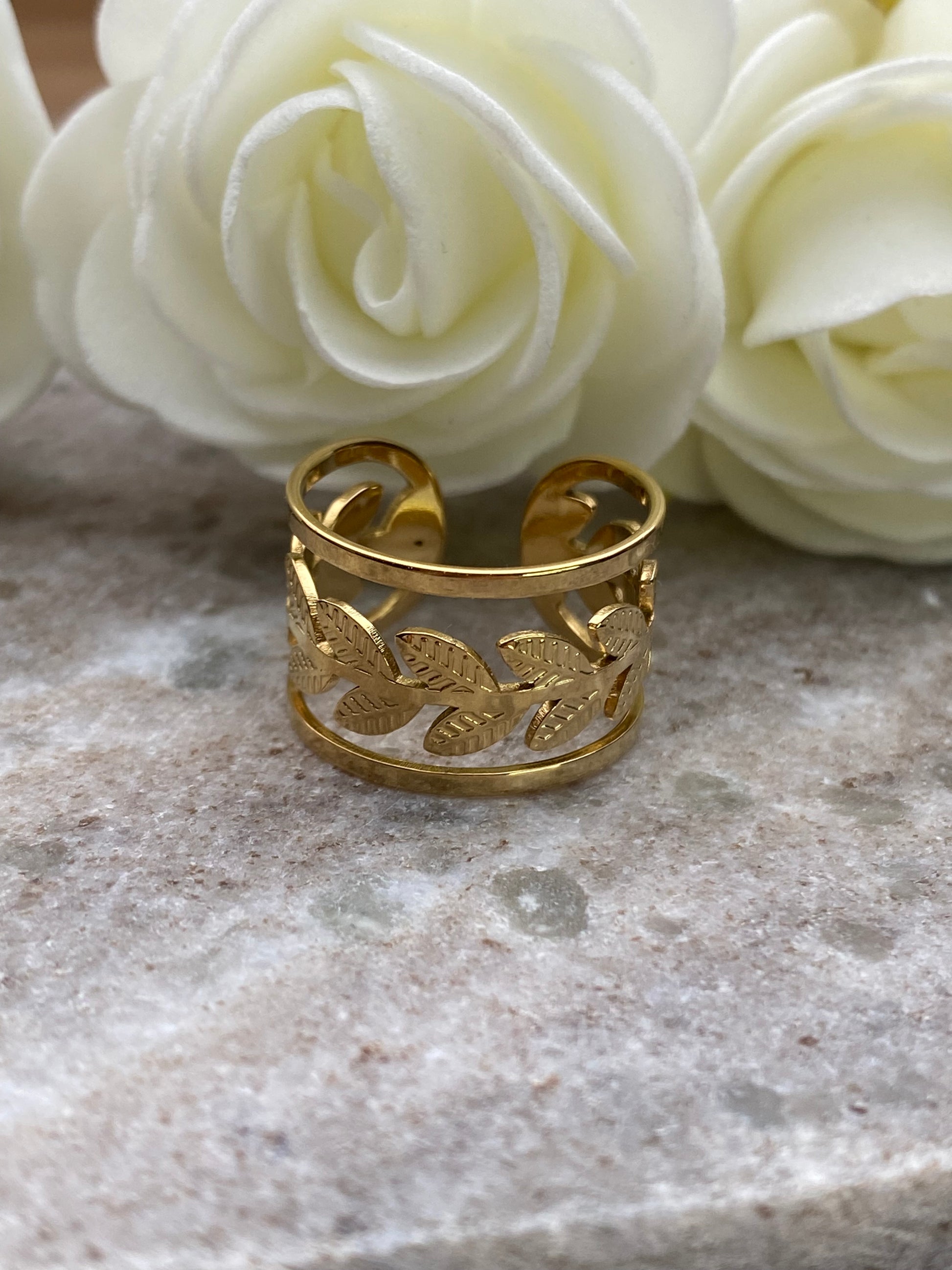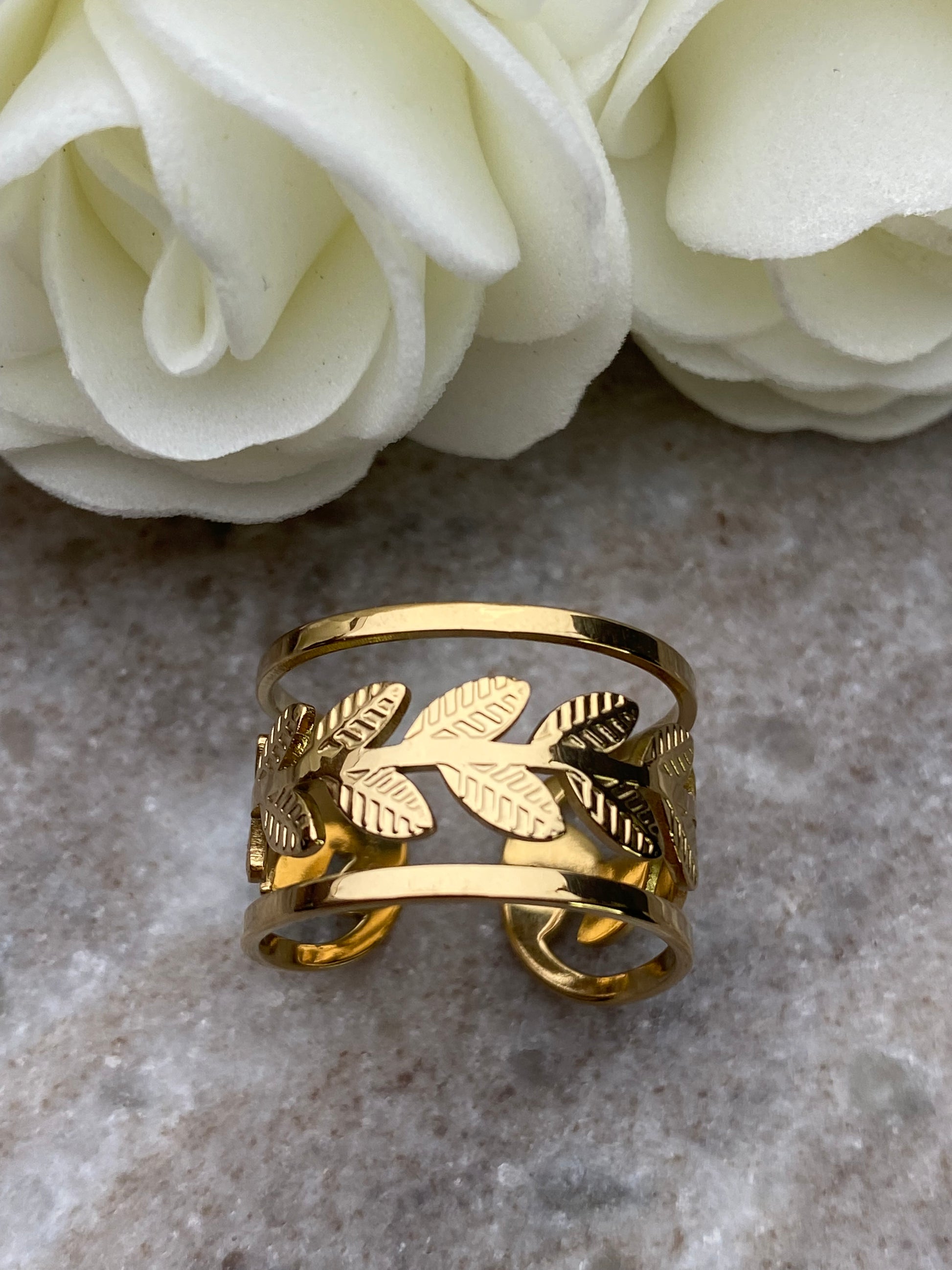 La bague Alix en acier inoxydable doré allie élégance et nature avec son design ajustable orné de délicates feuilles.