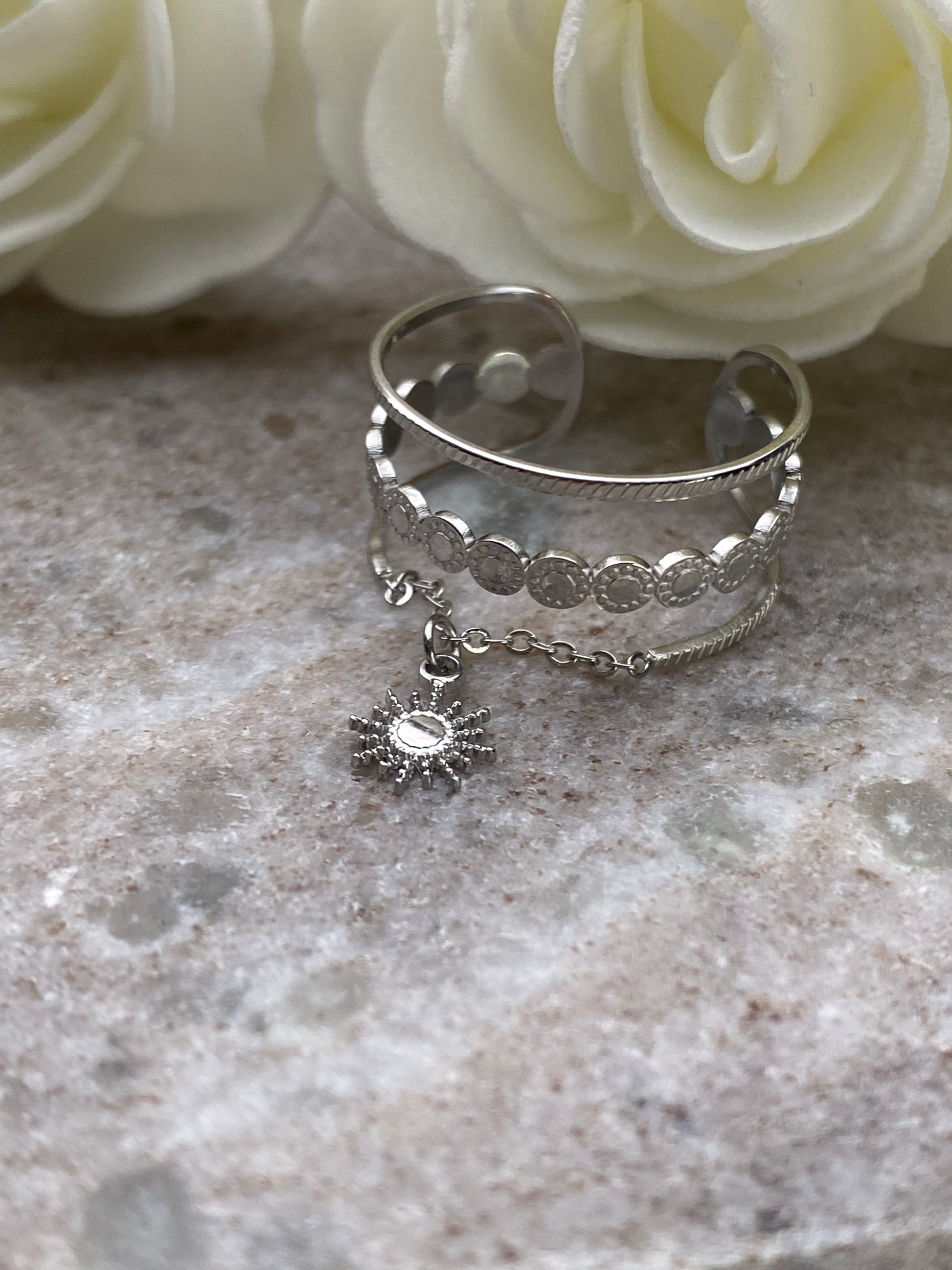La bague Louise en acier inoxydable offre un design ajustable pour un confort personnalisé.