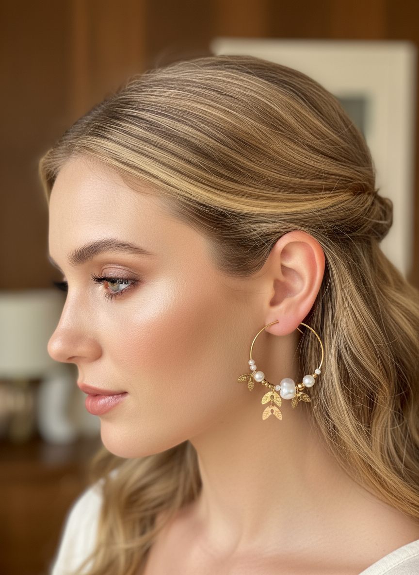 Boucles d'oreilles ornées de pendentifs feuilles, pierresblanches, et de perles en acier rondes en acier inoxydable.
