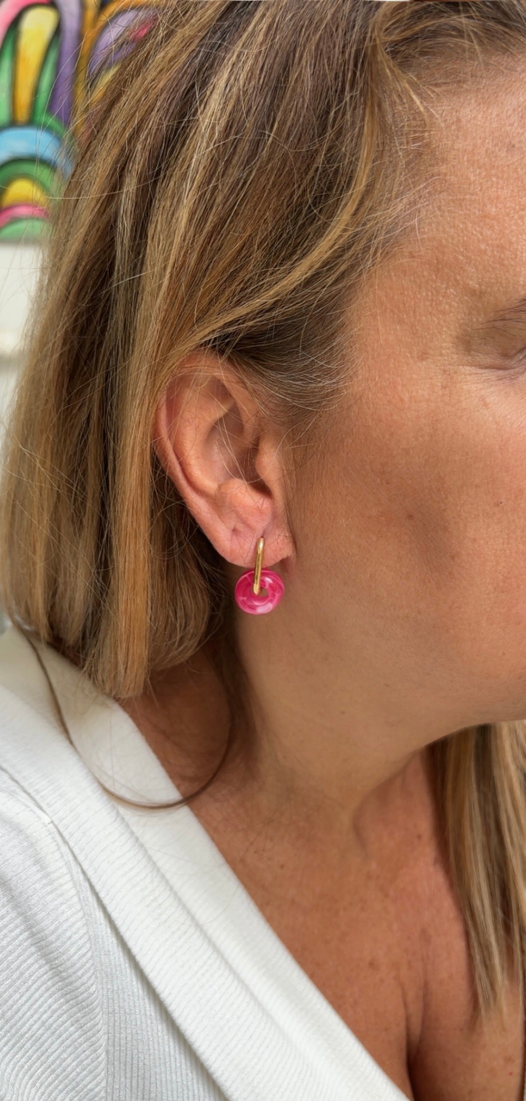 Composées d’un anneau doré et d’un pendentif rond en résine rose au fini marbré, elles allient finesse et originalité.Légères et faciles à porter au quotidien, elles subliment aussi bien une tenue décontractée qu’un look plus sophistiqué.