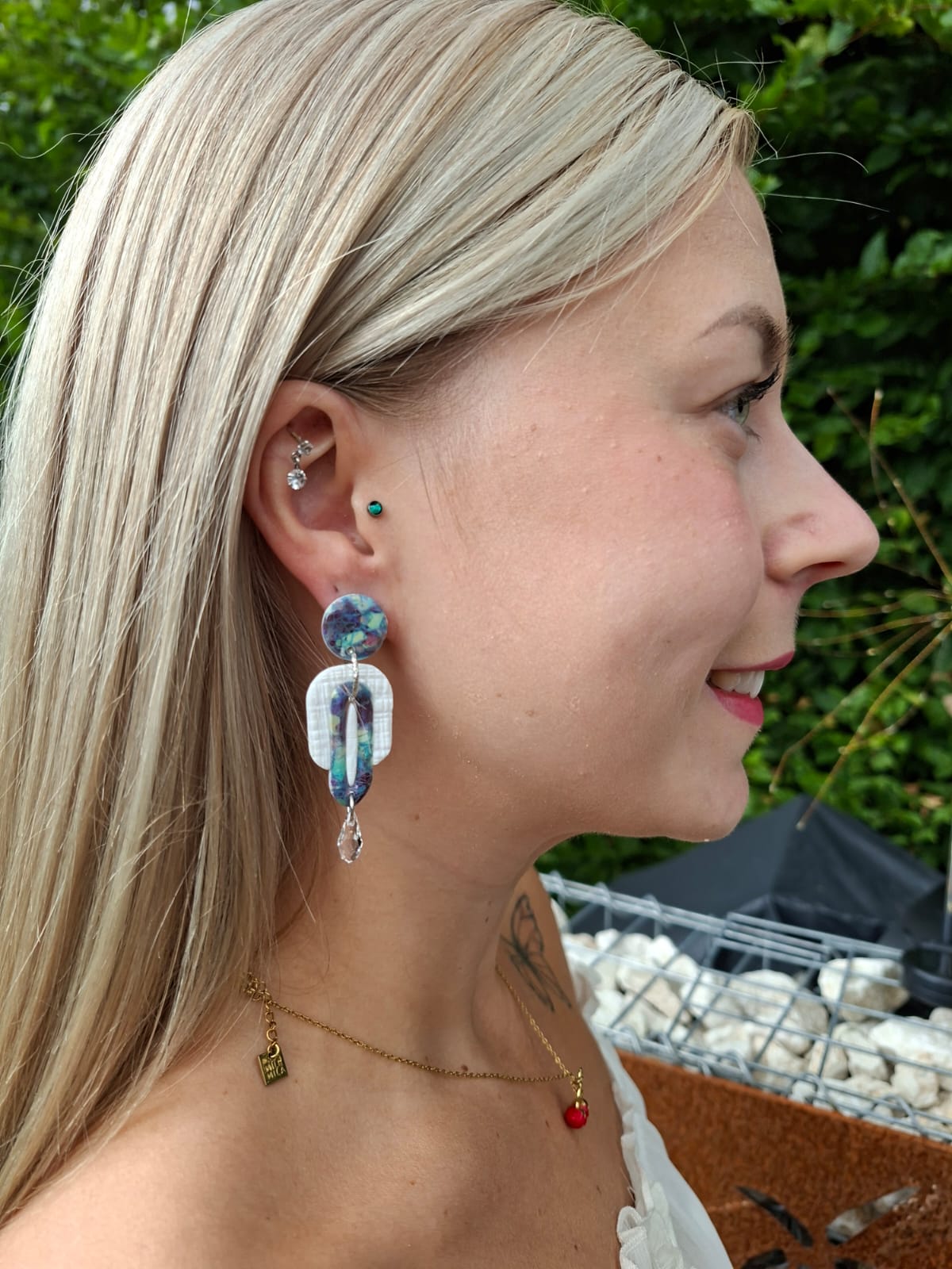 La boucle est une création artisanale alliant acier inoxydable, résine et pâte polymère.