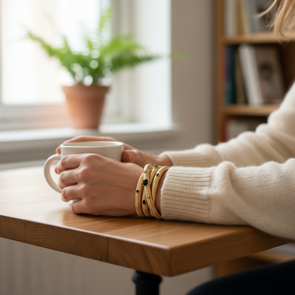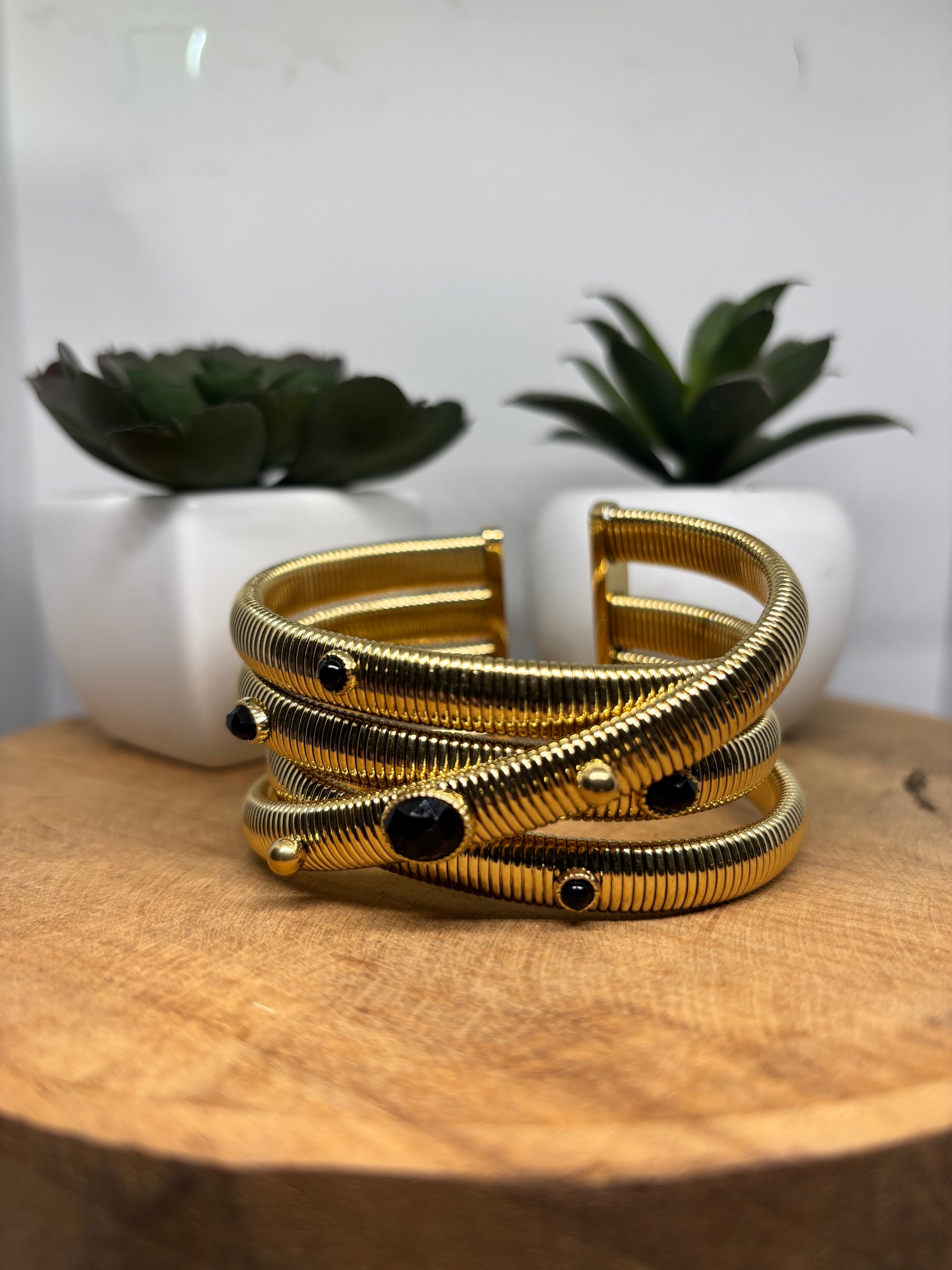 Bracelet manchette rigide en acier inoxydable avec pierres noires