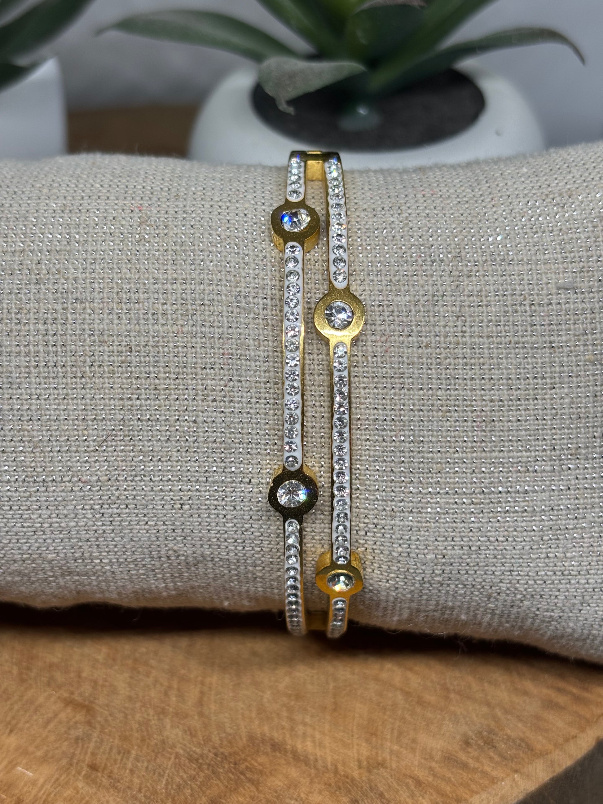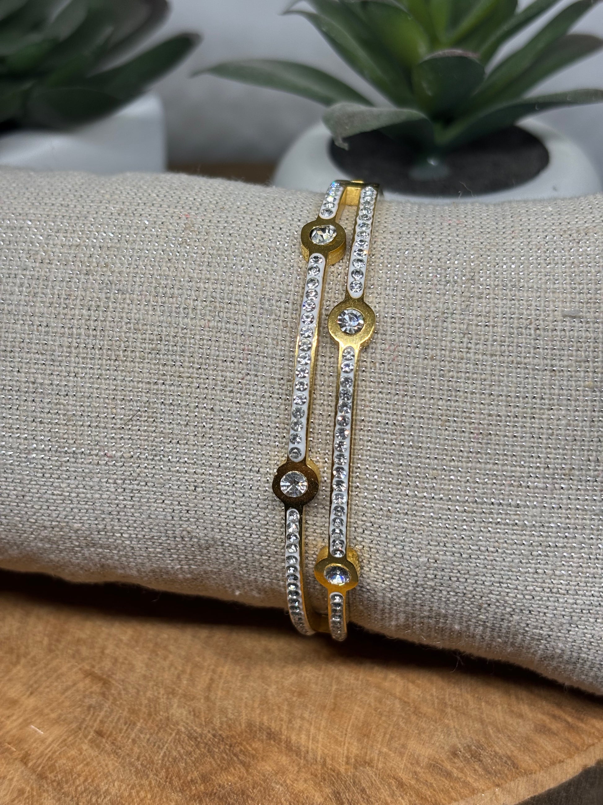 Bracelet en acier inoxydable jonc double rang en métal doré, orné de strass étincelants et de motifs ronds sertis de cristaux.