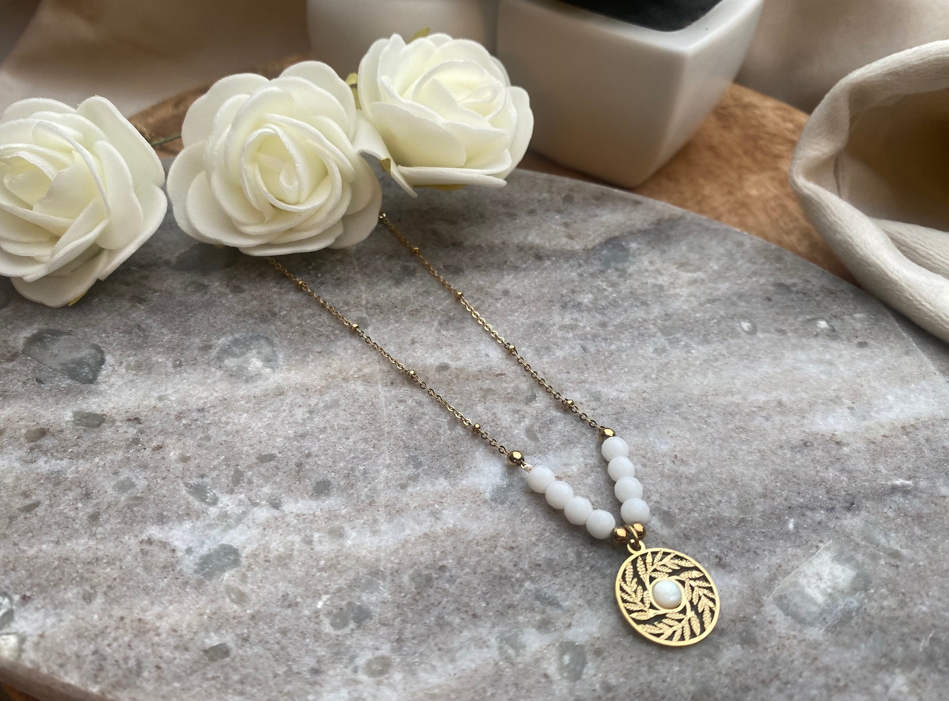Collier pendentif feuille et perles en acier inoxydable ajustable.