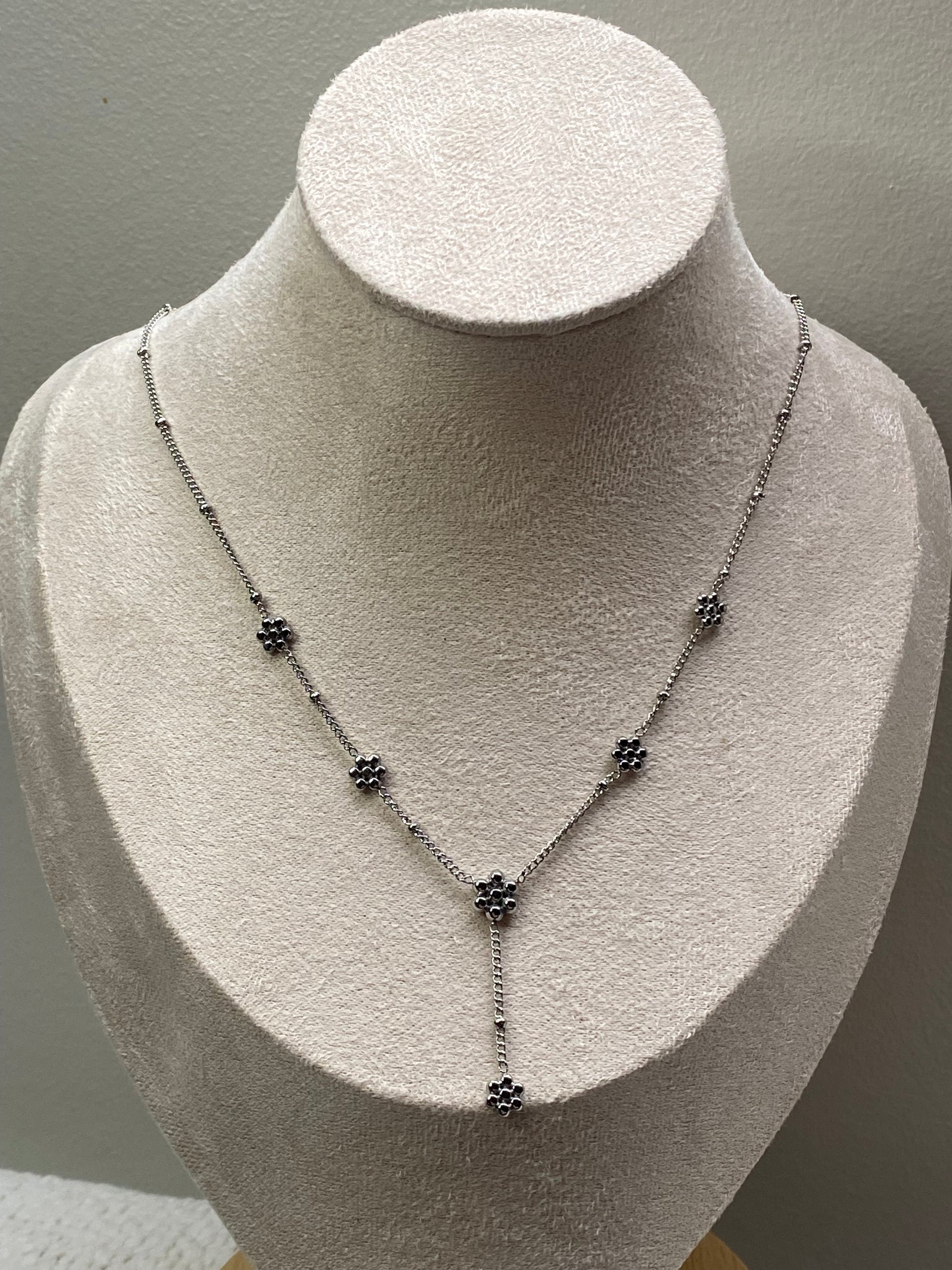 Le Collier Flora est une pièce élégante en acier inoxydable de couleur argent avec un pendentif orné de délicates fleurs.