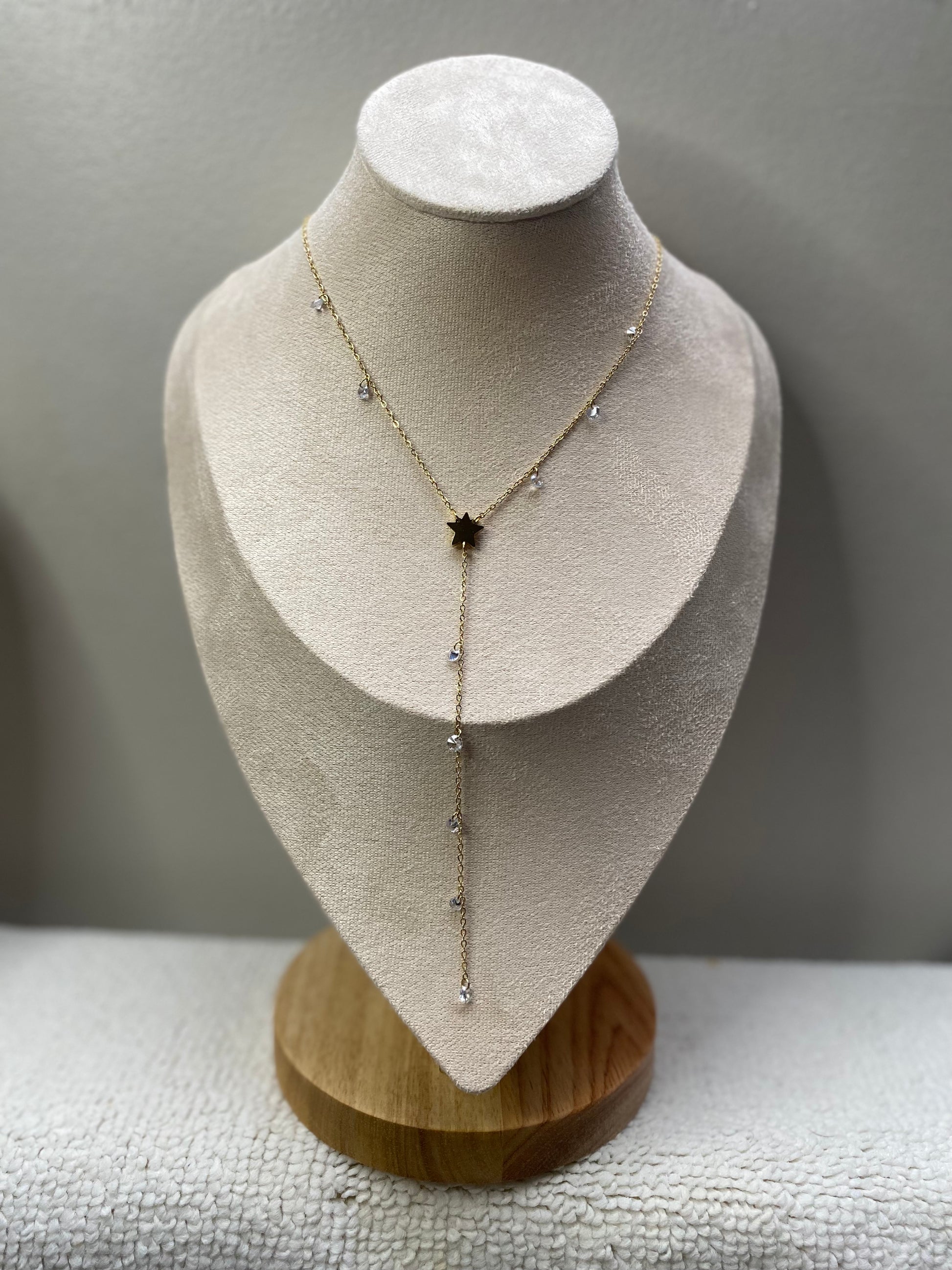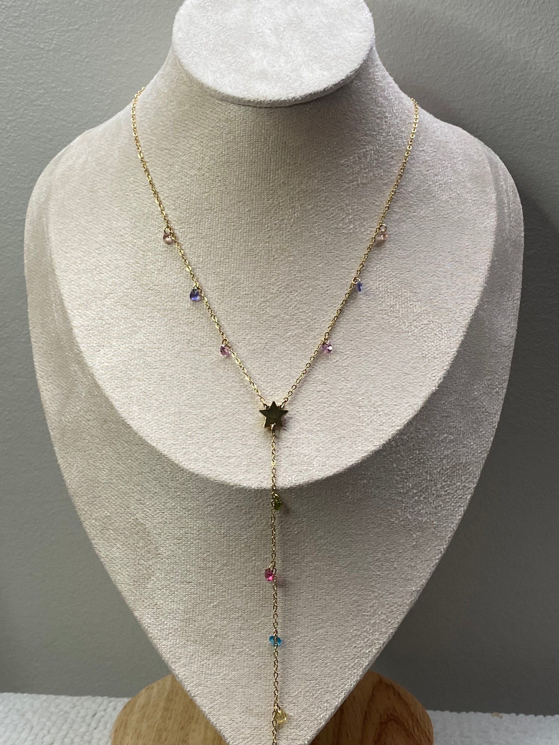 Le Collier Joy est un sautoir ajustable composé à 70 % d’acier inoxydable et orné de 30 % de strass scintillants, intégrant des motifs d’étoiles qui ajoutent une touche poétique à votre allure.