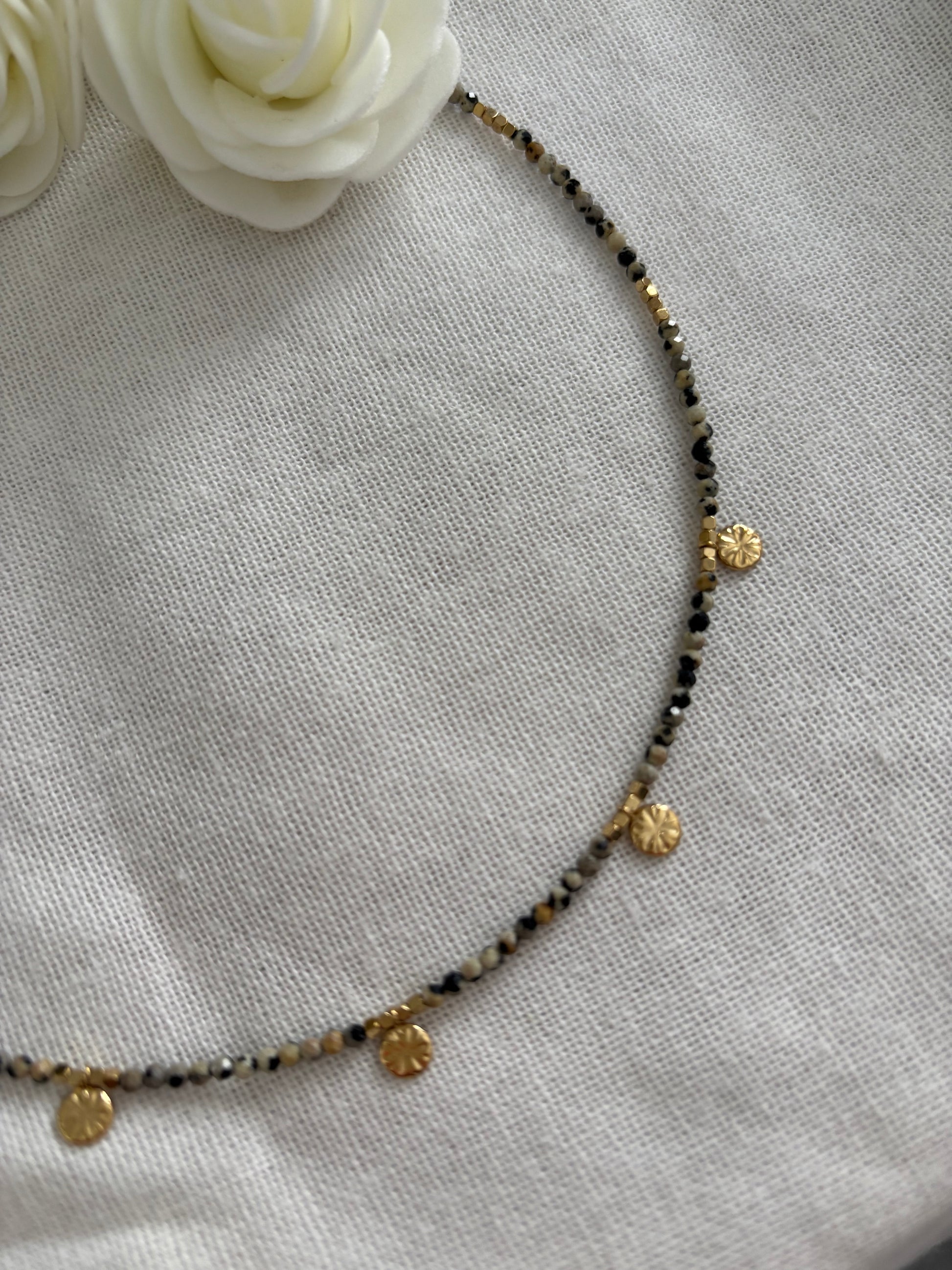Ajoutez une touche de poésie à votre tenue avec ce collier tout en finesse. Composé de perles en améthyste aux tons lavande et de petites breloques dorées finement gravées, il allie élégance et légèreté.