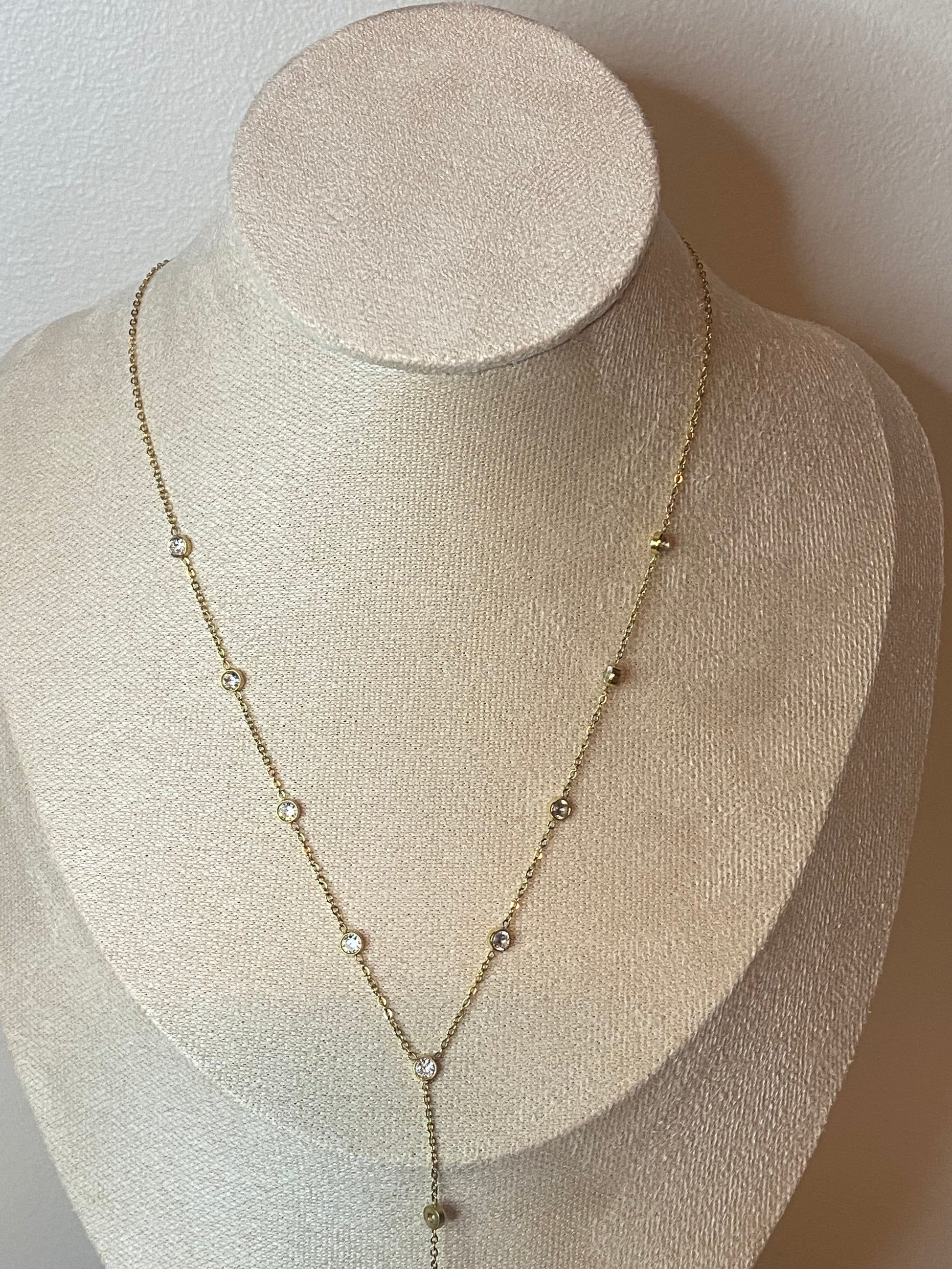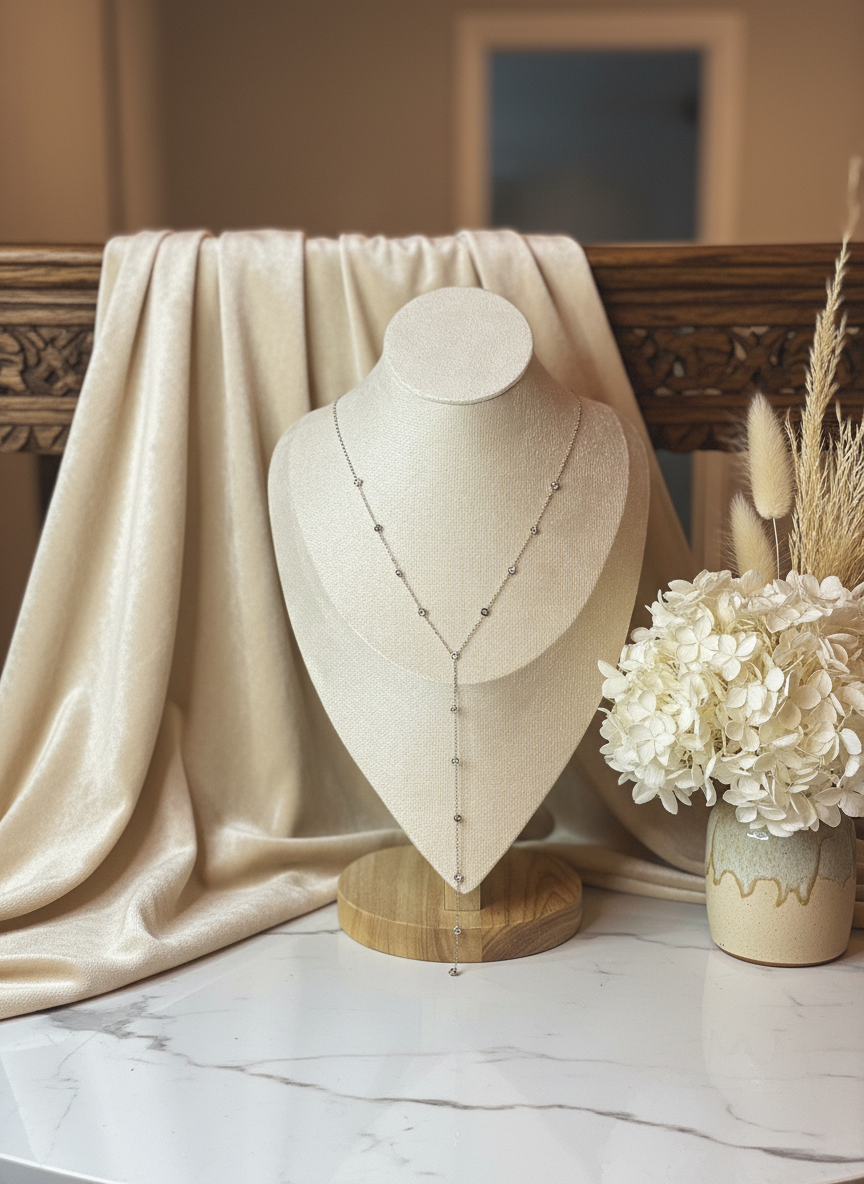 Le Collier Lya est un sautoir en acier inoxydable orné de strass, alliant élégance et éclat pour sublimer votre tenue avec douceur..
