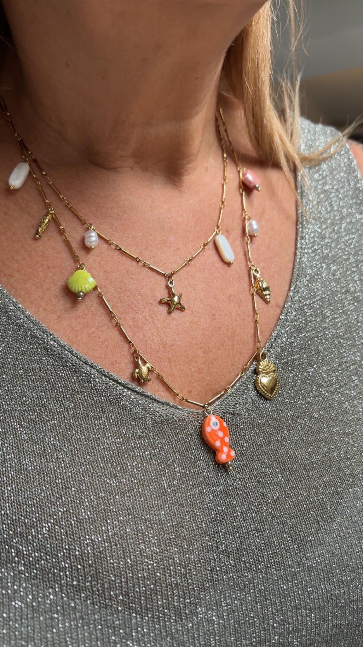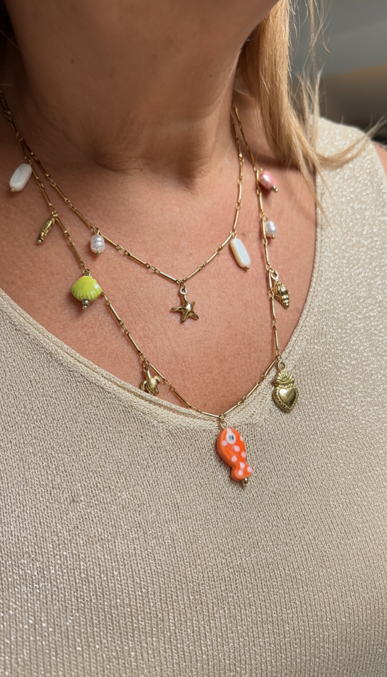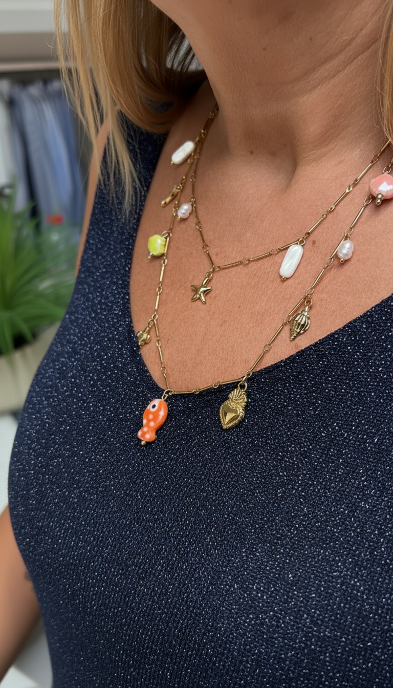 Composé de deux rangs de chaînes dorées ornées de charms délicats (étoile de mer, cœur sacré, coquillages, perles, et un poisson orange en céramique), ce collier évoque les trésors d’un bord de mer stylisé et moderne.