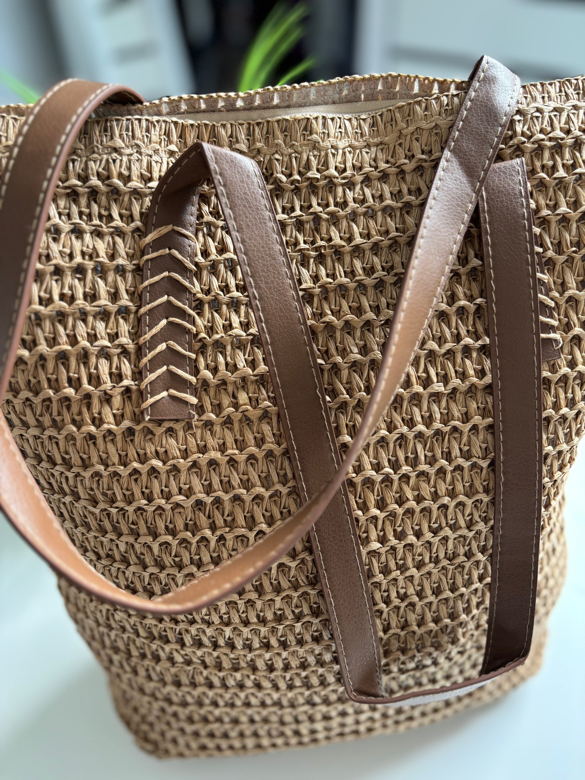 Alliez style et praticité avec ce sac cabas tressé au charme authentique. Confectionné dans une fibre naturelle au motif délicatement travaillé, avec des poignées en similicuir marron pour une touche chic et contemporaine. Idéal pour vos escapades à la plage, vos virées shopping ou simplement pour accompagner vos tenues estivales, ce sac allie légèreté, volume et élégance.